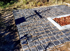 Засыпаем территорию участка пескобетонной смесью и начинаем укладывать брусчатку, одновременно монтируя заранее принесённый памятник.