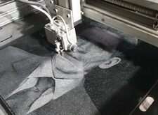 Исходя из пожеланий клиента мы выбрали оформление, сразу же после чего принялись за выполнение поставленной задачи. Первым этапом работы стала гравировка чёрно-белого изображения с помощью станка на прямоугольную плиту из полированного гранита.