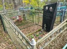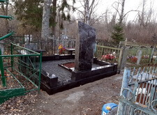 Так выглядит место захоронения во время промежуточного этапа работы: бетонный цоколь облицован гранитом, массивное надгробье установлено на своё новое место.