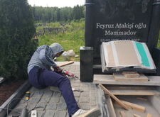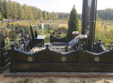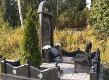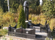 Собираем лавочку, устанавливаем её напротив надгробья. Цветник у подножья мемориальной стелы наполняем светлыми камнями. Под полукруглую арку памятника укрепляем вырезанную из гранита фигуру полумесяца.