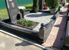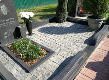 На нижеприведённых фотографиях представлен окончательный вид места захоронения. Мы поставили на место памятник, сделали цветник, уложили внутрь участка гранитную брусчатку. По периметру места захоронения проходит старый цоколь, на этот раз укреплённый на надёжное и добротное основание. В правую половину участка высадили две туи (одну в специальную клумбу, другую в пластиковую кадку), в цветник поместили барвинок. В таком виде объект был представлен клиенту, который остался очень доволен проделанной работой.